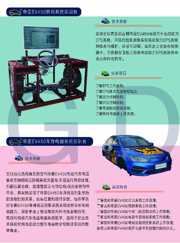 帝豪EV450轉(zhuǎn)向系統(tǒng)實(shí)訓(xùn)臺(tái)&車身電器系統(tǒng)實(shí)訓(xùn)臺(tái)